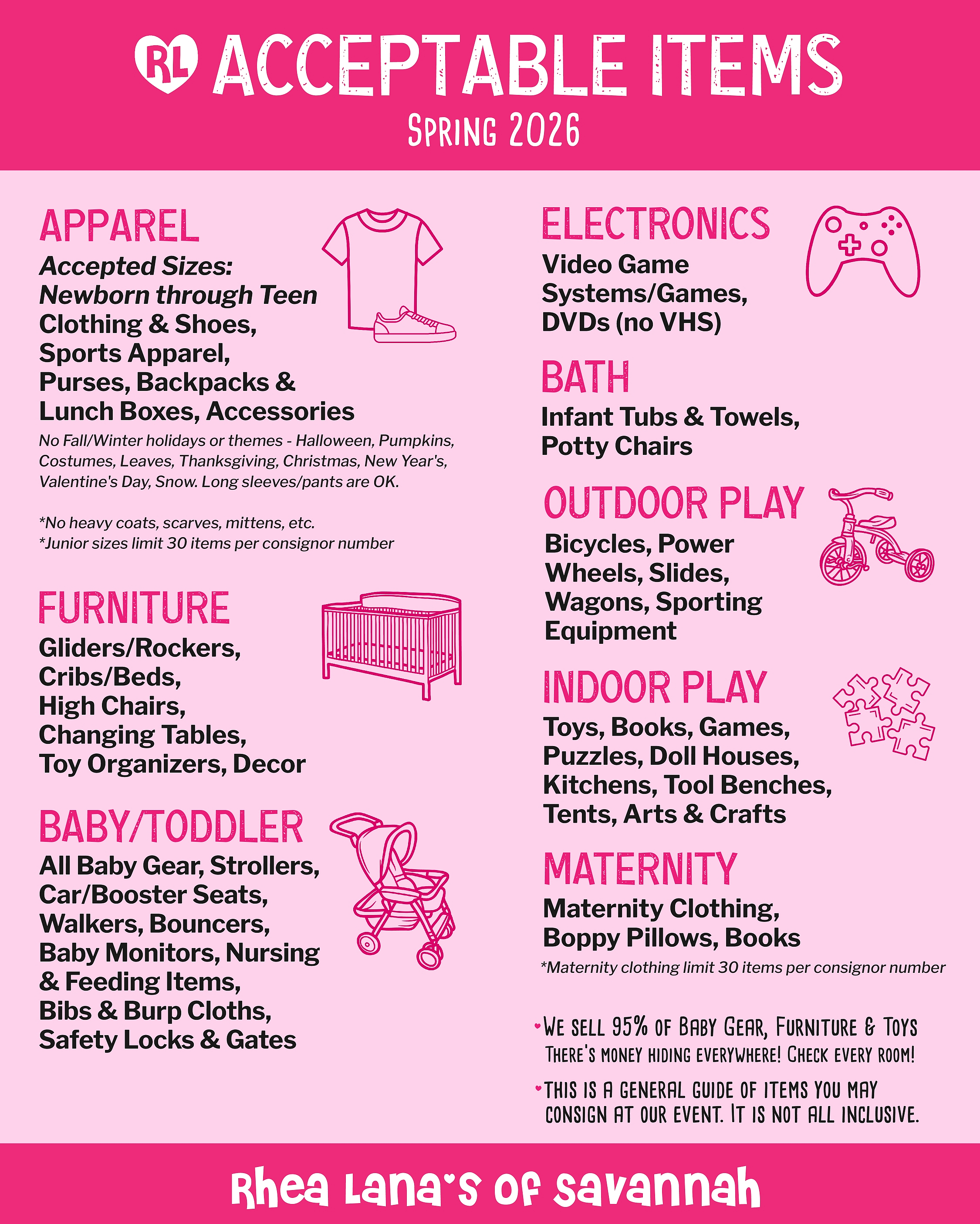 Boy's sizes 0-20, girl's sizes 0-16 and junior sizes 1-15 in teen styles. All must be no more than 1-2 years old, clean and odor-free. Limit of 30 Junior Girls items per consignor number.